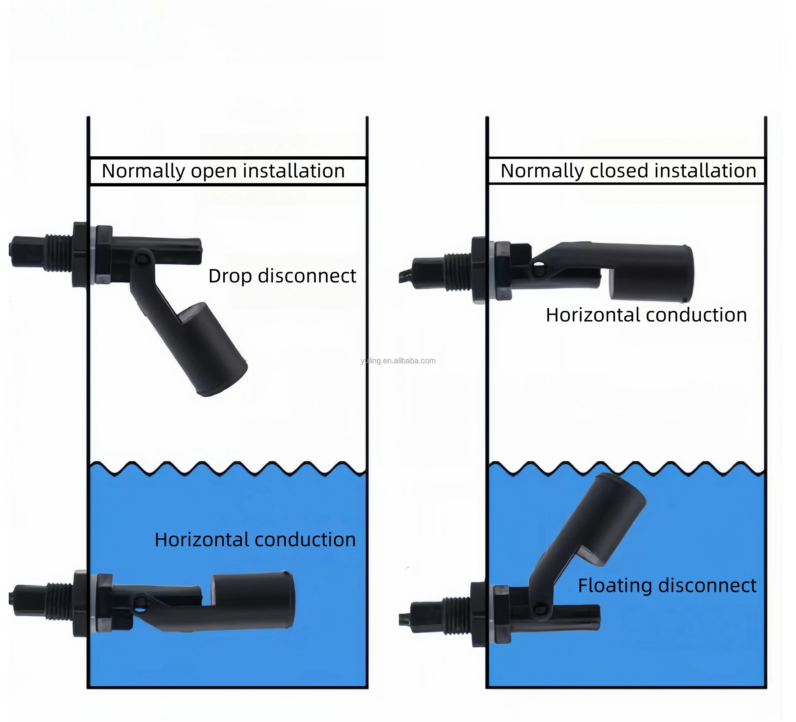 This water pump float switch is widely used to control the liquid level. Our float switch quality is stable, safe, .Float Switch’s operation voltage is 220vac, and current can be up to 10A. Applies to branch water,sewage,aid-base solution and oil. float switch make use of mercury switch as contact component. When liquid lift up to contact float, the float will have variable angles. The switch will have ON or OFF contact signal output when the angle is larger than 10 Degree.